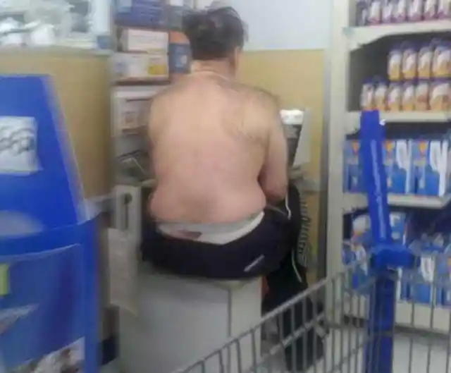Next, he's sitting on the self-checkout machine while trying to scan himself. To top it all off, he's wearing tighty-whities with a gaping hole in them! Everthing imaginable is wrong with this Walmart scenario.