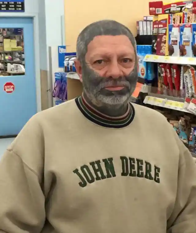 We’ve heard of Grecian Formula but this, as they say, is ridiculous. What on Earth was this guy thinking, that we wouldn’t notice he used shoe polish all over his face and head?