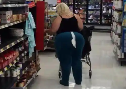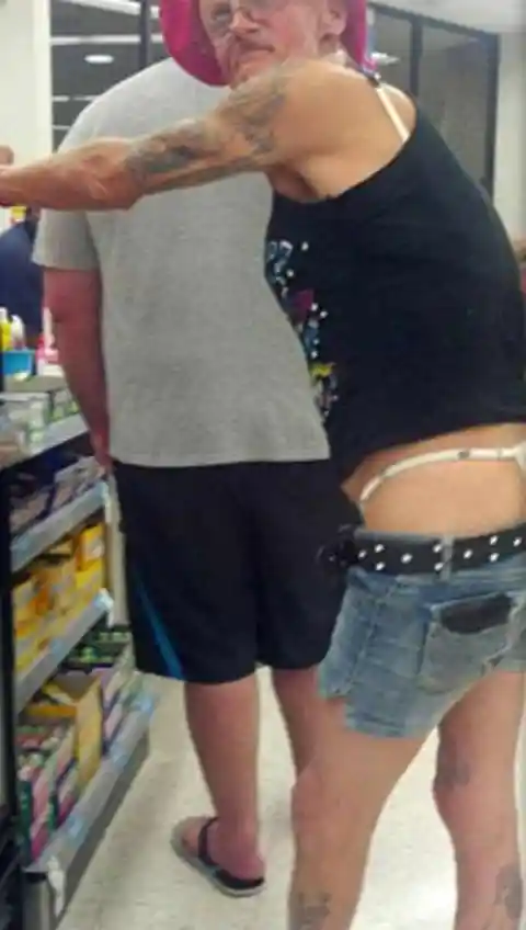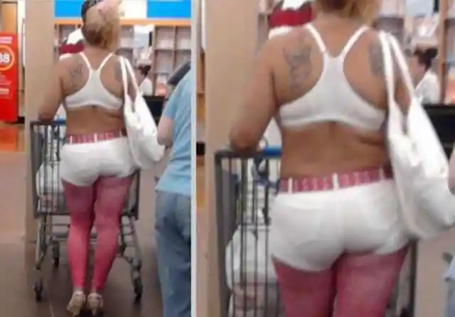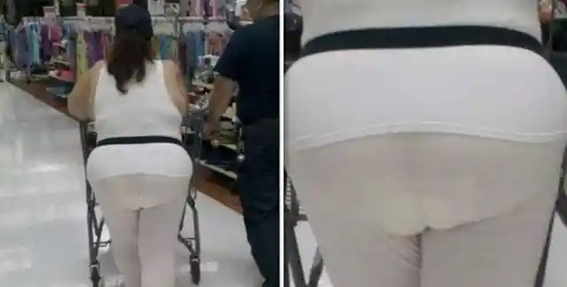 Look lady, were not judging you on your outfit choice because to each his own, but you can't tell me that you walked out of the house NOT knowing that your backside is on display for fellow shoppers....There are children in this store, come on lady!