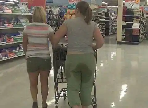 First of all, if it's that time of the month, an all-white outfit probably isn't the best choice. Second of all, maybe pick pants that aren't see-through. Third of all, sorry to the people who got stuck behind her in line on the way out, we hope you covered your childrens' eyes!